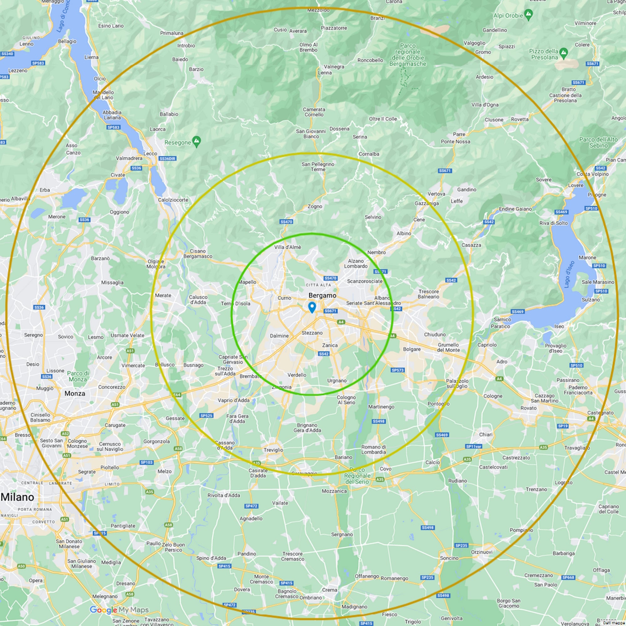 La mappa illustra le zone di consegna* per le biciclette Morgale. Le consegne nell'area verde sono gratuite, mentre in quella gialla hanno un costo di 30€ per noleggio e in quella arancione 45€ per noleggio.